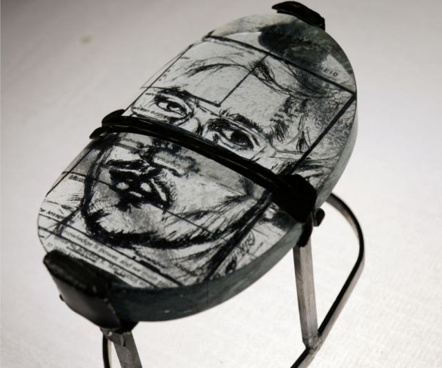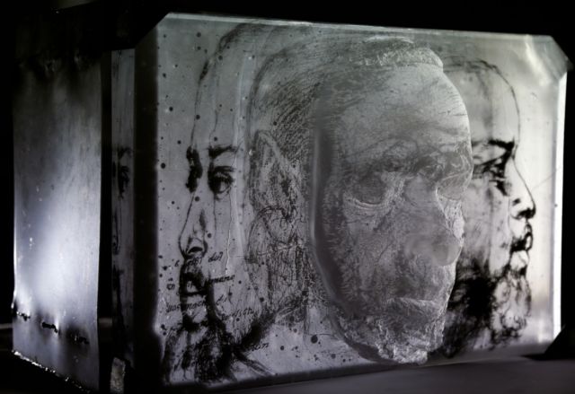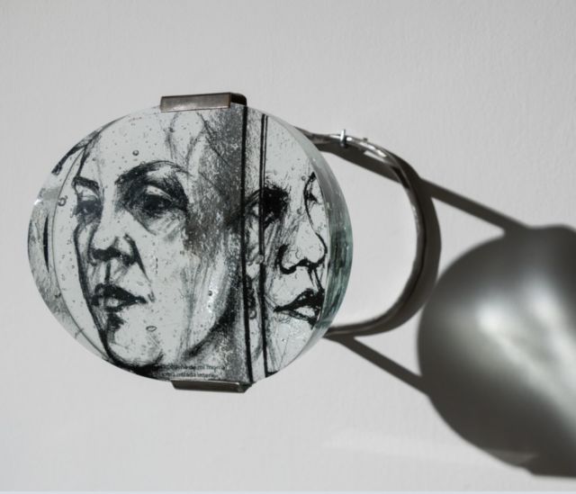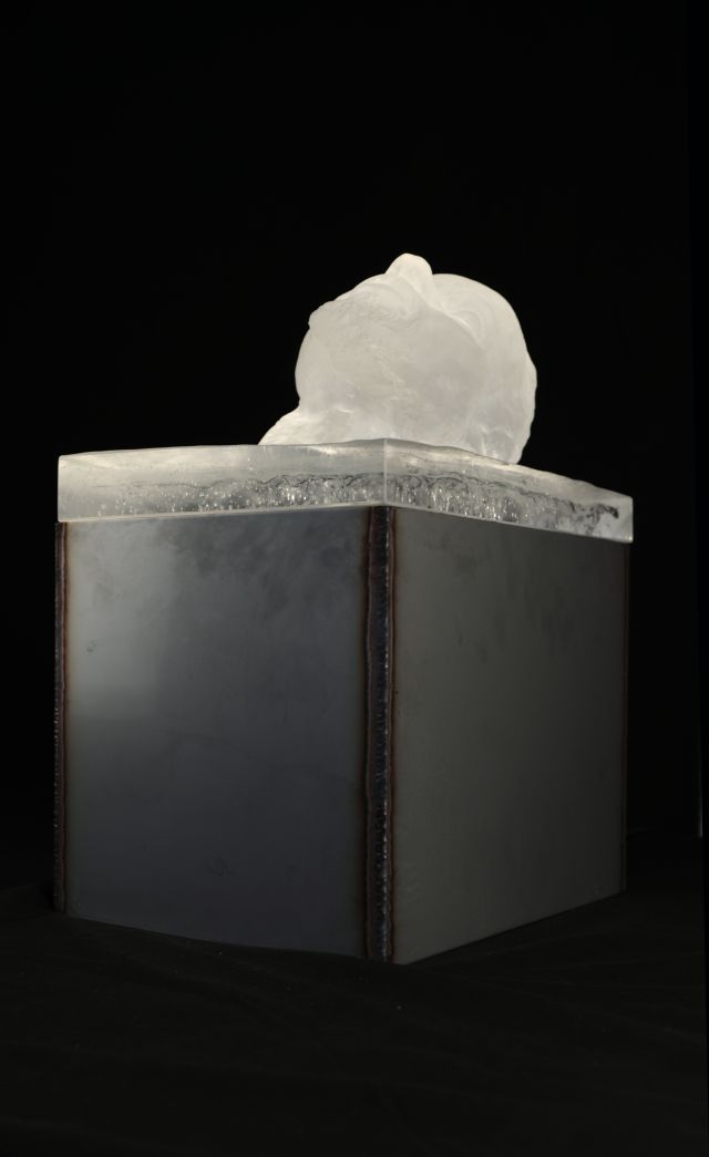 Claudia Virginia Vitari, Interstitial Identities, Umaru Umaru's portrait, 2024, iron lightbox, lost-wax cast transparent glass with silk-screen printing, kiln- cast, ground and sandblasted, spotlights, cm 25x28x36