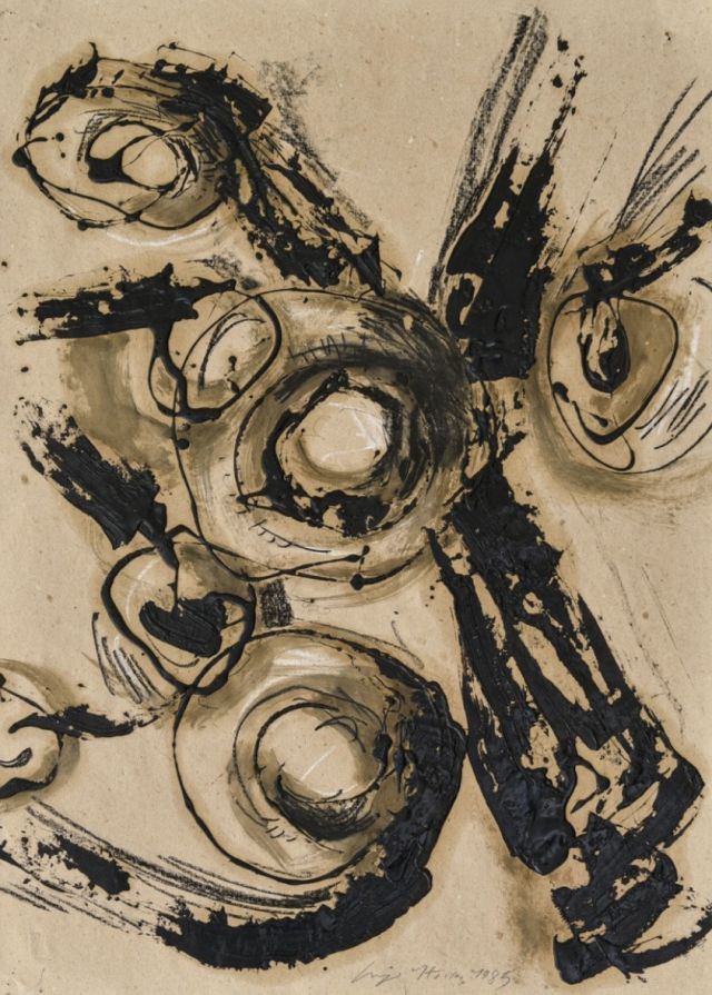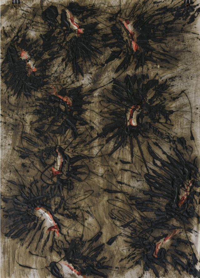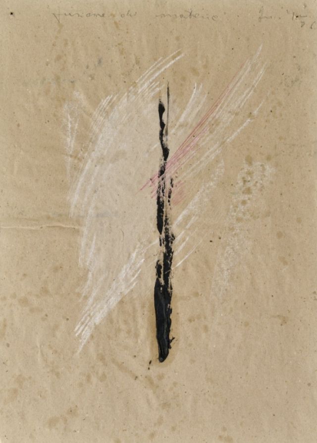 Luigi Stoisa, Senza titolo (gomme con strada), 1985, gessetto, carboncino e catrame su carta, cm 70 x 48,5